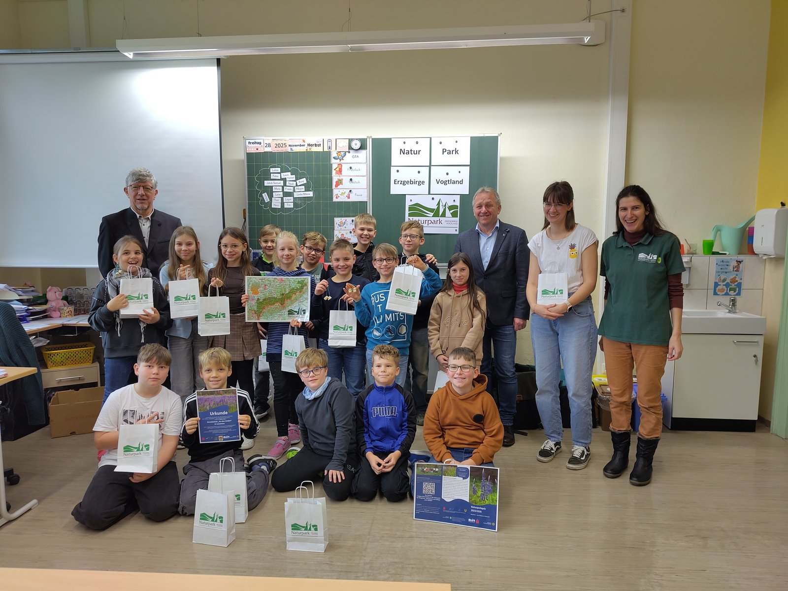 Mit einer Urkunde für eine zweitägige Klassenfahrt überraschte der 2. Beigeordnete Jörg Höllmüller stellvertretend für den Landkreis Mittelsachsen gemeinsam mit dem Bürgermeister der Stadt Lunzenau, Ronny Hofmann, am 28.11.2025 die Schülerinnen und Schüler. Die Freude über den Gewinn war groß. Toni Bittner, der stellvertretende Klassensprecher, nahm die Urkunde entgegen. Im Juli kommenden Jahres geht die Fahrt in die Herberge des Naturschutzzentrums Erzgebirge in Dörfel, verkündete Christina Melzer vom Naturpark Erzgebirge/Vogtland.